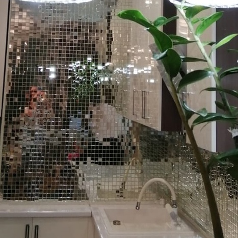 Использована серебристая зеркальная плитка "восьмиугольник" и золотистая зеркальная плитка квадратной формы.
